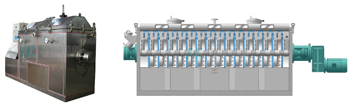 該設(shè)備采用全新的結(jié)構(gòu)和工作原理,它們的主要結(jié)構(gòu)如下圖所示。在一個臥式長槽形容器內(nèi)組合排列了很多空心冷卻板片,中心攪拌軸從所有的冷卻板片內(nèi)穿越通過,在每兩個空心冷卻板片之間安裝有阻流式分隔圓盤和很多旋輪推進刮壁式攪拌裝置,刮壁攪拌使所有的冷卻表面都起到清壁作用,使傳熱和冷卻效率大大提高。